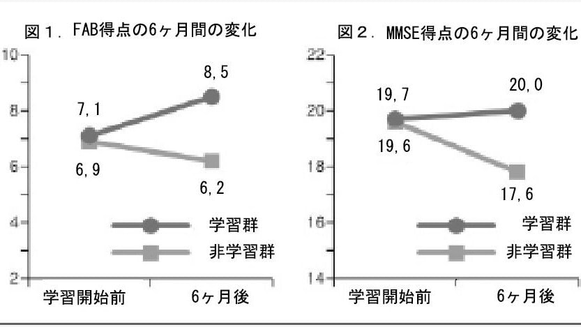 2001年9月、東北大学・川島隆太教授をリーダーとする共同研究チームによって、社会福祉法人道海永寿会で初めての学習療法の実践研究がスタートしました。この研究は公文も参加し、独立行政法人・日本科学技術振興機構の助成を受けた産・官・学の共同プロジェクトとして実施されました。 「読み書き」「計算」学習の効果を測定するために、認知症高齢者を学習群と非学習群(学習をしない群)に分け、学習開始前および6ヵ月後にFABとMMSEを実施して両者を比較しました。図1と図2がその結果で、明らかに高齢者の脳機能が改善されていることが分かります。